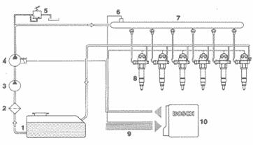- топливный бак; 2 - фильтр; 3 - топливоподкачивающий насос; 4 -насос высокого давления; 5 - редукционный клапан; 6 - датчик давления; 7- аккумулятор; 8 -форсунки; 9 - ввод данных от измерительных датчиков; 10 - ECU.
