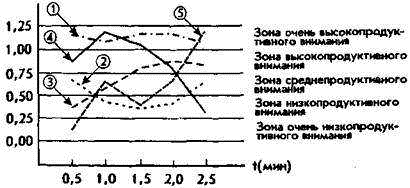 2. Кривая, представленная линией типа •••• Это график низкопродуктивного, но устойчивого внимания.