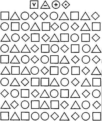 Тестовое задание в этой методике предназначено для оценки переключения и распределения внимания ребенка. Перед началом выполнения задания ребенку показывают рис 3. и объясняют, как с ним работать. Эта работа заключается в том, чтобы в каждом из квадратиков, треугольников, кружков и ромбиков проставить тот знак, который задан вверху на образце, т.е., соответственно, галочку, черту, плюс или точку.