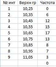 (=E10+E7). Подсчитываем частоты появления результатов измерений в интервалах.