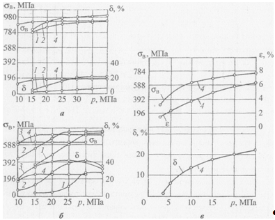 Рис.5.3. Вплив тиску зварювання на властивості з'еднань при нормальній температурі сплавів ЗП99 (а), ЗИ602 (б), ВЖ98 (в) і при температурах зварювання: 1 -1100; 2- 1150; 3 -1175; 4- 1200 °С
