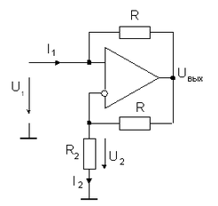 Существует множество путей для синтеза отрицательного сопротивления, один из которых состоит в подсоединении трех положительных линейных резисторов к управляемому напряжением источнику напряжения для формирования преобразователя отрицательного сопротивления. Это устройство привлекательно с экспериментальной точки зрения, поскольку легко осуществимо при помощи операционного усилителя (ОУ).