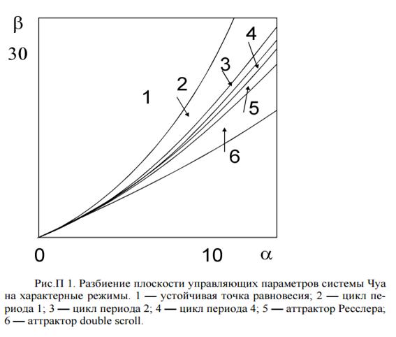 управляющих параметров системы Чуа на характерные режимы. Цифрами на рисунке