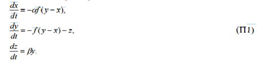 Здесь переменные x,y,z пропорциональны соответственно напряжениям vC1, vC2 и току iL, соответственно. f(x) - это нормированная кусочно-линейная зависимость.
