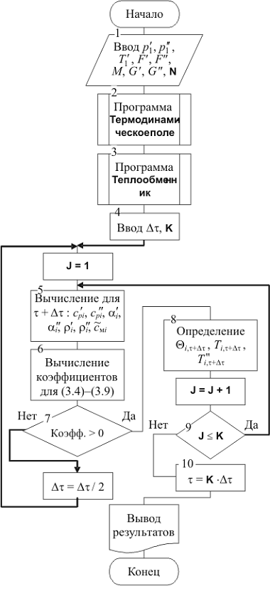 В блоке 1 осуществляется ввод исходной информации, при этом исходное распределение температур определяется блоком 3 в результате решения подпрограммы Теплообменник. В блоке 2 находится программа, процедуры которой используются для вычисления параметров термодинамического поля рабочих веществ в блоках 5 и 6. Блоком 4 вводится исходное значение шага по времени Δτ и счетчик циклов прогонки решений K. В блоке 7 определяется знак коэффициентов конечно-разностных выражений. В случае их положительных значений по явной схеме решения в блоке 8 отыскивается новое распределение температур подсистем в момент τ + Δτ. С помощью блока 9 решение повторяется с нарастанием шага по времени. Если один из коэффициентов имеет отрицательное значение, то берется новое значение Δτ = Δτ / 2 и решение возобновляется. В конце решения результаты счета выводятся на печать.