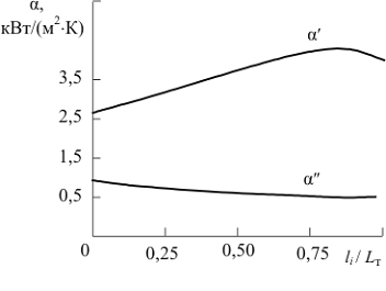 Поскольку эффективность теплообмена в аппарате I в определенной мере характеризуется изменением коэффициентов теплоотдачи по длине теплообменника, в предварительном численном экспери-менте получены данные об их распределении вдоль канала.