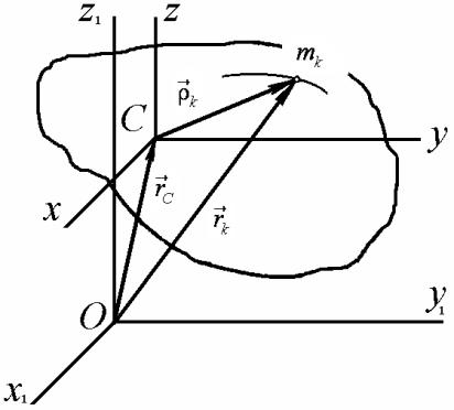 Ox1y1z1 - основная (условно неподвижная) система координат. Сxyz - подвижная система координат с началом в центре масс С движется поступательно по отношению к основной системе отсчета Ox1y1z1. (система координат