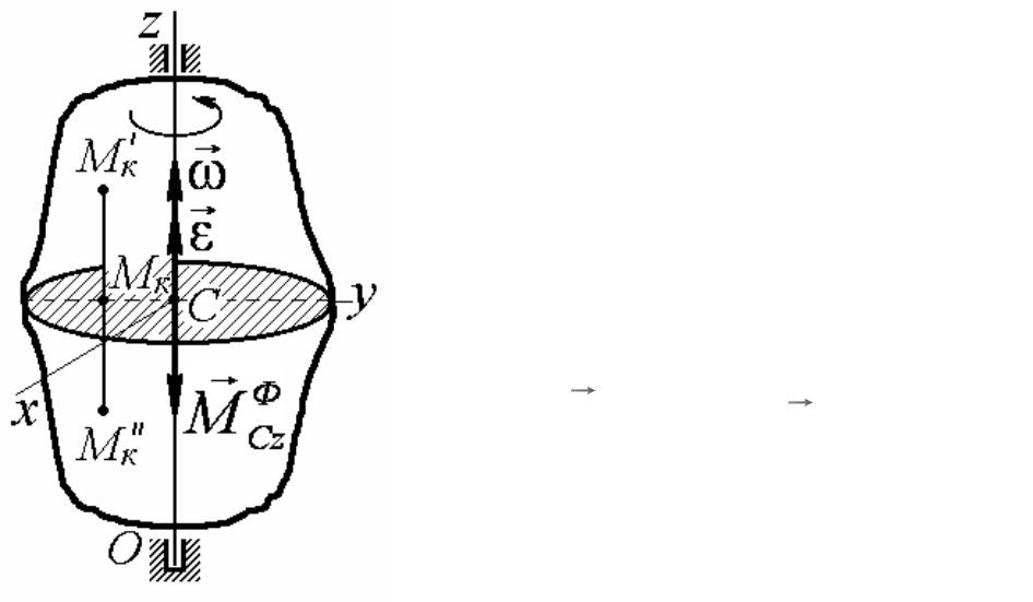 Главный момент в этом случае равен нулю. Объясняется это тем, что при поступательном движении ускорения всех точек тела одинаковы и равны ускорению центра масс ak =aC . Тогда все силы инерции образуют систему параллельных сил, которые, как известно из статики, приводятся к