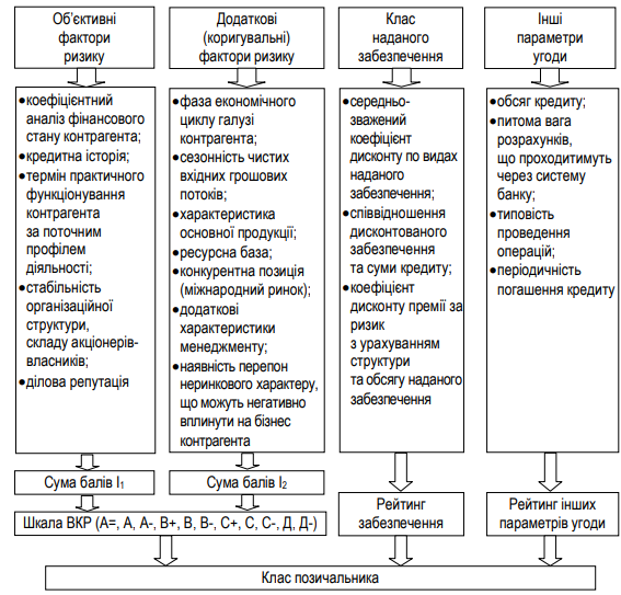 Визначення внутрішнього кредитного рейтингу (далі ВКР) здійснюється для контрагентів банку за кредитними операціями – юридичних осіб, у тому числі підприємств, організацій, установ усіх форм власності, які проводять свою діяльність на нефінансових ринках (у тому числі поручителів за позиками) [20]. Рейтинг позичальника повинен являти собою банківську оцінку можливості і готовності позичальника виконати контрактні зобов’язання незалежно від несприятливих економічних умов або настання неочікуваних подій. Діапазон економічних умов, що враховуються при оцінці, повинен включати поточний стан та ситуації, що можуть виникнути протягом виробничого циклу в межах даної галузі або регіону. Визначає ВКР кредитний експерт банку.