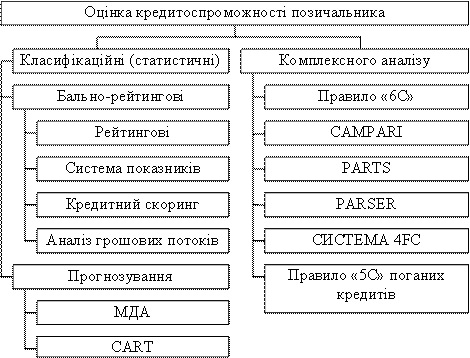 Методики аналізу і система показників кредитоспроможності потенційного позичальника, що використовуються комерційними банками, досить різноманітні. Умовно їх можна розбити на класифікаційні (статистичні) методи оцінки та комплексний аналіз кредитоспроможності [14] (рис. 1.2).