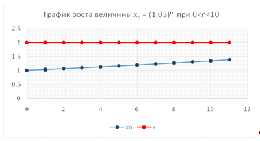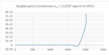 Разумеется, что при ежегодном росте в 3 % гарантировано удвоение через 34 года. Однако эффект начисления процентов на проценты приводит к тому, что уже через 24 года величина x0 удвоится: