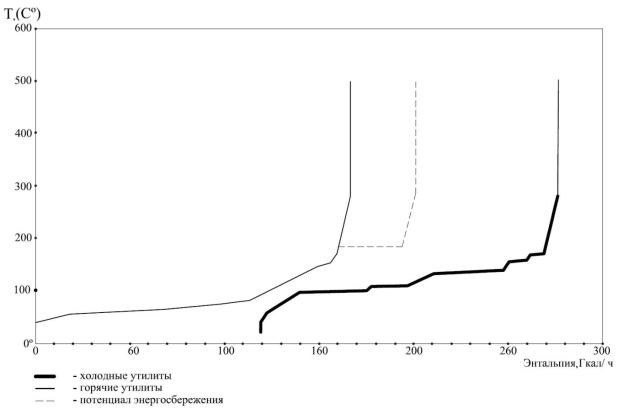чению ΔTmin. Уровни энергоносителей при пересечении с общей композитной кривой также смещаются на ½ значения ΔTmin – температура горячих энерго-