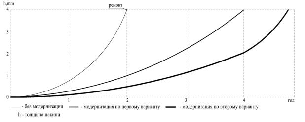 Рисунок 36 – Скорость нарастания накипи в зависимости от выбранного варианта модернизации