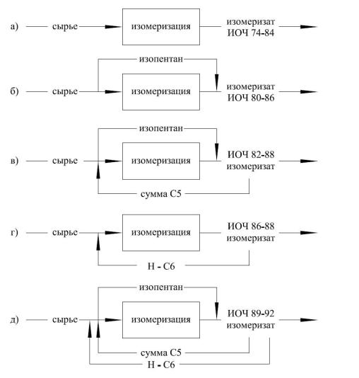 а – схема «за проход»; б – схема с предварительным извлечением изопентана; в – схема с предварительным извлечением изопентана и рециркуляцией нормального пентана; г – схема с рециркуляцией нормального гексана; д – схема с предварительным извлечением изопентана, рециркуляцией нормального пентана и нормального гексана.