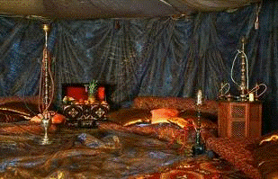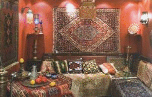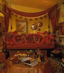 Обклейте стены коричневато-оранжевыми обоями(оттенок корицы). Потолок обшейте темным деревом. На пол постелите темно-красные ковры, затканные густым орнаментом. Поставьте в спальню пару диванов без спинки, в форме софы. Добавьте к ним пару-тройку оранжево-коричневых пуфиков из мягкой кожи. Небрежно набросьте на диваны шелковые и кашемировые шали и покрывала в рыжевато-коричневой гамме, с узором. Туда же накидайте множество атласных подушек и валиков, украшенных бахромой, шелковыми шнурами и золотыми кистями. Задрапируйте окно полупрозрачными материями 2-х тонов - цвета корицы и темно-желтого или золотистого. Столик накройте скатертью, свисающей до пола. Поставьте на стол латунные вазы, кувшины, подсвечники. Осветите комнату маленькими светильниками с приглушенным светом. Зажгите свечи и ароматические палочки.