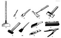 Инструменты для подготовки поверхности: а - стальной скребок; б - скарпель; в - зубило; г - штукатурный молоток; д - бучарда; е - кувалда; ж - окамелок; з - металлическая щетка; и - щетка; к - нож штукатурный; л - ручные ножницы по металлу