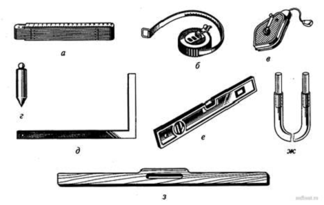 д - угольник; е - строительный уровень; ж - водяной уровень; з - рейка-правило.