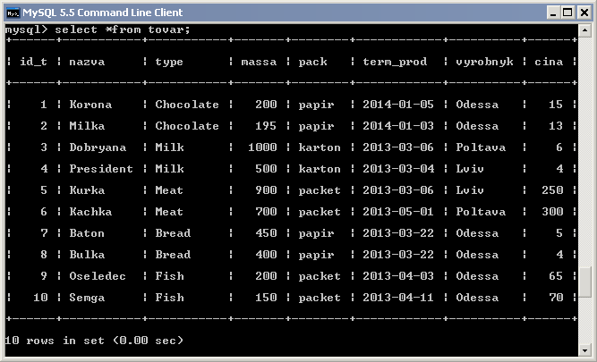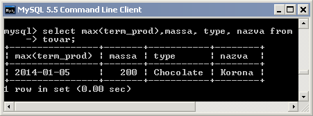 Вивести інформацію про продукт з мінімальним терміном придатності.