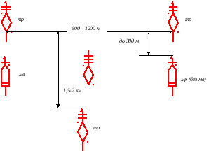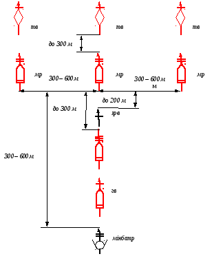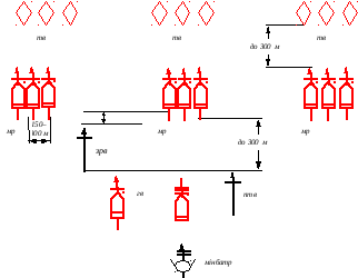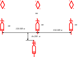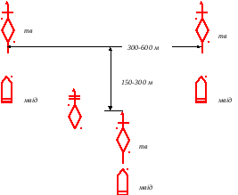 Мал. 6. Передбойовий порядок посиленої танкової роти. Положення взводів – кутом назад (варіант)