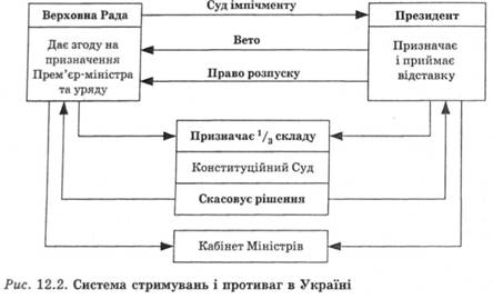 Основою стабільного функціонування системи державної влади демократичної держави є система стримувань і противаг, яка забезпечує взаємну підконтрольність різних гілок і центрів державної влади та запобігає концентрації влади в одній гілці чи в руках однієї особи. Отже, розглянемо систему стримувань і противаг в Україні (рис. 12.2). Основними складовими цієї системи у парламентсько-президентській республіці є: подвійність джерел формування виконавчих структур, імпічмент, право розпуску парламенту, право вето, конституційний нагляд. Система конституційного нагляду в Україні, здійснюваного Конституційним Судом, є стандартною, повністю відповідає світовій практиці й не спричиняє серйозних нарікань правового характеру.
