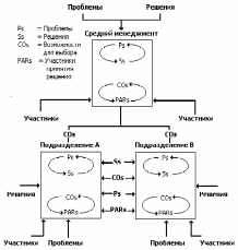 С учетом концепции четырех потоков общая схема принятия управленческих решений в организации приобретает случайный характер. Проблемы, предлагаемые решения, участники и выбранные решения — все это проходит через организацию. В определенном смысле, организация является большой корзиной для мусора, в которой все эти потоки смешиваются, как показано, на рис. .3. Если проблема, решение и участник случайно соединяются в одной точке, то проблема может быть урегулирована; но если решение не подходит данной проблеме, проблема может остаться нерешенной. Таким образом, наблюдая организацию в целом и рассматривая ее в крайней степени неопределенности, можно увидеть, что есть проблемы, которые не решаются, и есть решения, которые не срабатывают. Решения не поддаются упорядочиванию и не являются результатом пошаговой логической последовательности. Ситуация может быть настолько сложной, что решения, проблемы и результаты совершенно независимы друг от друга. Когда они сталкиваются, то какие-то проблемы решаются, но большинство так и остаются нерешенными.