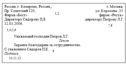 . При оформлении реквизита "Адресат" почтовый адрес воспроизводится в соответствии с Правилами оказания услуг почтовой связи, которые рекомендуют следующую последовательность: название улицы, номер дома, номер офиса, название города, почтовый индекс.