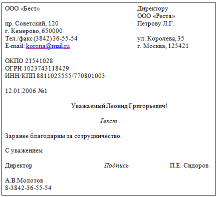 Обязательными реквизитами письма-благодарности являются: наименование организации, справочные данные об организации, код организации, основной государственный регистрационный номер (ОГРН) юридического лица, идентификационный номер налогоплательщика/код причины постановки на учет, дата, регистрационный номер, адресат, заголовок к тексту (при составлении письма на бланке формата А4), подпись, отметка об исполнителе.