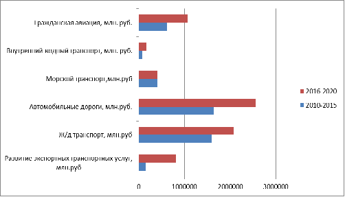 . Структура инвестиций в развитие экспортных транспортных услуг (предусматривают создание эффективной транспортной инфраструктуры, позволяющей реализовать транзитный потенциал страны и в полной мере использовать отечественные транспортные коммуникации для обеспечения международных трансконтинентальных связей) на протяжении периода 2010-2015 годов менялась неоднозначно, несмотря на это, большую часть составляли внебюджетные инвестиции (от 62% до 76%), однако в планируемом периоде 2016-2020 финансирование предполагает уравновесить доли бюджетных и внебюджетных инвестиций;