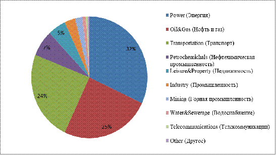 Как видно из представленной выше диаграммы, среди основных направлений мирового проектного финансирования, 58% составляют отрасли производственной инфраструктуры, а именно энергоснабжение, транспорт, телекоммуникации и водоснабжение, что еще раз доказывает эффективность такого способа финансирования среди объектов, обеспечивающих инфраструктурное развитие. Стоит отметить, что структура мирового проектного финансирования существенно не меняется на протяжении последних 6 лет (согласно Project Finance Reviews). Объективные данные относительно сформировавшейся структуры российского проектного финансирования не предоставляется возможным осветить в данном исследовании вследствие отсутствия как таковой статистики среди компетентных источников.