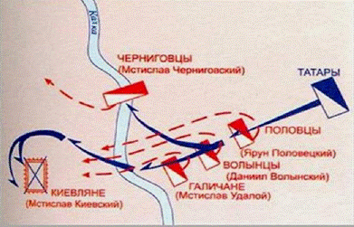 Впервые монголо-татары появились в Европе в начале 1223 г. Это был разведывательный отряд полководцев Джебе и Субедея. Ройдя Дербентский перевал, монголы проникли на Северный Кавказ и встретили сопротивление половцев и алан. Монголы разбили их поодиночке. С остатками своей орды хан Котян перешел Дон, Приазовье, Днепр и обратился за помощью к своему зятю Мстиславу Галицкому. Он уговаривал русских князей объединиться: «Если не поможете нам, то сегодня мы будем разбиты, а на другой день – вы». Князья решили действовать вместе с половцами.