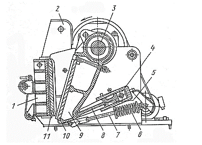 Дробилка со сложным движением щеки (рисунок 1) состоит из подвижной щеки 9, которая представляет собой стальную отливку, расположенную на эксцентричной части приводного вала 3. В ее нижней части имеется паз, куда вставлен сухарь для упора распорной плиты 8.