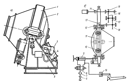 Основными сборочными единицами бетоносмесителя (рис.6,а) являются опорные стойки 5, смесительный барабан 2 с располагаемыми на его внутренней поверхности лопастями, электродвигатель 3, пневмоцилиндр опрокидывания барабана 4 и цилиндрическая обечайка 1, внутренняя поверхность которой облицовывается набором сменных листов из износостойкой стали.