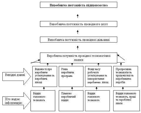 Вихідні дані та послідовність розрахунків, за якими визначається виробнича потужність підприємства, наведені на рис.1.1.