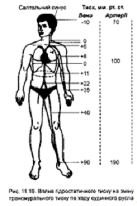 У людини, що стоїть, виникає ефект зміни тиску на стінку судини - це трансмуральний тиск крові( або гідростатичний тиск), який зумовлений впливом стовпа крові в судинах, розташованих вздовж тулуба