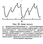 На запису венного пульсу - флебограмі (див. мал. 38, Б) помітні три позитивні (і, а, с) і дві негативні (х, у) хвилі, кожна з яких відображає певну фазу серцевого циклу.