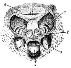 бородавка; 3- задня бородавка; 4- анальний горбок; 5- крибеллум.