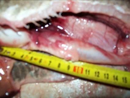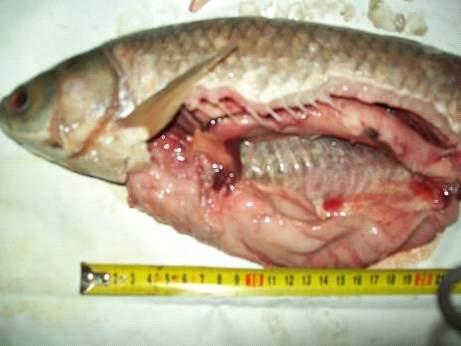 Рисунок 4.8. Вигляд внутрішніх органів білого амура із обстежуваного ставка. Видні відкладення жиру вздовж кишкового тракту та жирове переродження печінки