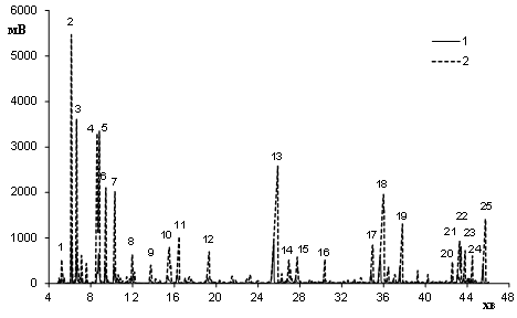 кислотно активований сапоніт; 1, 3 - сапоніт, модифікований ПДМС, 2, 4 -