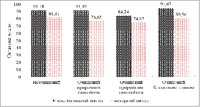 Гідрофобізовані зразки сапонітової глини готували наступним чином. Природного мінералу розтирали у фарфоровій ступці, просіювали через сита з розмірами комірки 1,0 мм із нержавіючої сталі, зберігали при нормальній температурі 20 ± 2 º C та відносній вологості j = 65%. З метою утворення вторинної розвинутої пористості сапоніту, його прожарювали при 100 °С дві години. Потім сапоніт змішували із емульсіями для гідрофобізації на основі ПДМС чи ПС (концентрацією від 20 до 35 %) при співвідношенні Т:Р 2:3. Модифікацію проводили при температурі 40 - 60 ° С протягом 4 годин у реакторі з безперервним перемішуванням. Одержаний осад промивали дистильованою холодною та теплою водою, відфільтровували та сушили при 50 °С протягом 2 годин.