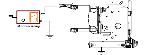 Измерение производится относительно и двух других заземленных фазах. Выключатель включается, все фазы заземляются, к одной фазе выключателя подключается мегаомметр. Заземление с этой фазы выключателя снимается, производится измерение сопротивления изоляции. Затем заземление восстанавливается, мегаомметр переключается на другую фазу выключателя. Производятся аналогичные операции для всех фаз последовательно. Всё время проведения измерений выключатель остаётся включенным. Сопротивление изоляции электромагнитов управления производят в зависимости от внутренней схемы привода выключателя. Измерение производится относительно земли на одном из полюсов электромагнитов (электромагнита), при этом целостность катушки проверяется отдельно путём измерения сопротивления омметром.