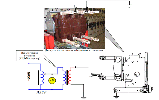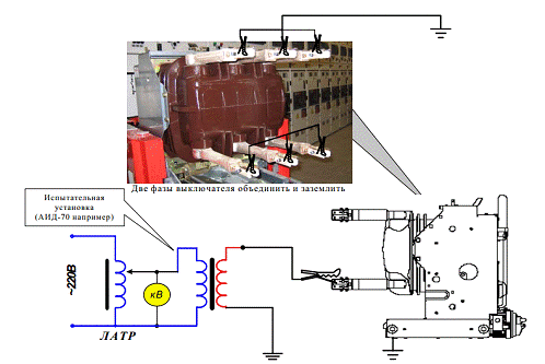 Испытание производится в два этапа - сначала производится пофазное испытание основ-ной изоляции выключателя, затем производится испытание выключателя «на разрыв». Для проведения испытания основной изоляции выключатель, также как и в опыте измерения сопротивления изоляции, включается, все фазы заземляются. Подготавливается испытательная установка, подключается к испытательному объекту. Снимается установленное ранее заземление. Производится плавное поднятие напряжения до необходимого уровня (напряжение поднимается скачком до 1/3 необходимой величины, затем увеличение производится плавно со скоростью 1-2кВ в секунду вплоть до необходимого уровня испытательного напряжения), напряжение выдерживается в течение 1 минуты, и, затем, плавно понижается до нуля. На испытанную фазу выключателя устанавливается заземление, испытательная установка отсоединяется и подключается к следующей фазе.
