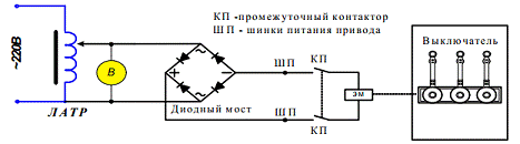 Включение в цепь электромагнитов управления активного сопротивления неприемлемо, так как в первоначальный момент за счёт индуктивности катушки на неё будет приложено полное напряжение оперативного тока. С помощью ЛАТРа напряжение снижается до уровня 0,75Uном для электромагнитов выключателей, работающих на постоянном токе, и 0,65Uном для электромагнитов выключателей, работающих на переменном токе. При включении выключателя напряжение на зажимах ЭМУснизится до требуемой величины за счёт падения напряжения в схеме испытательной установки.