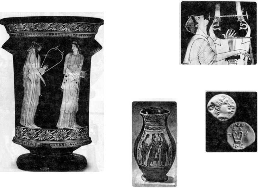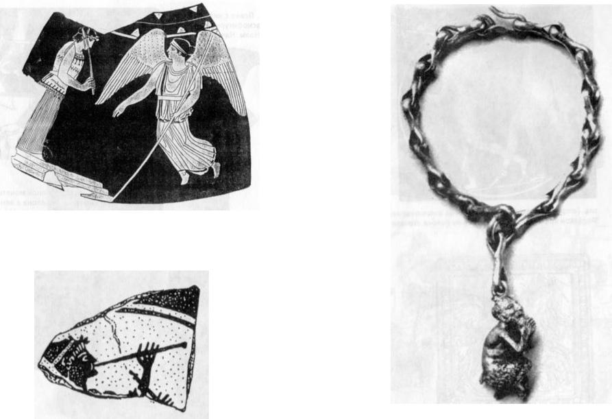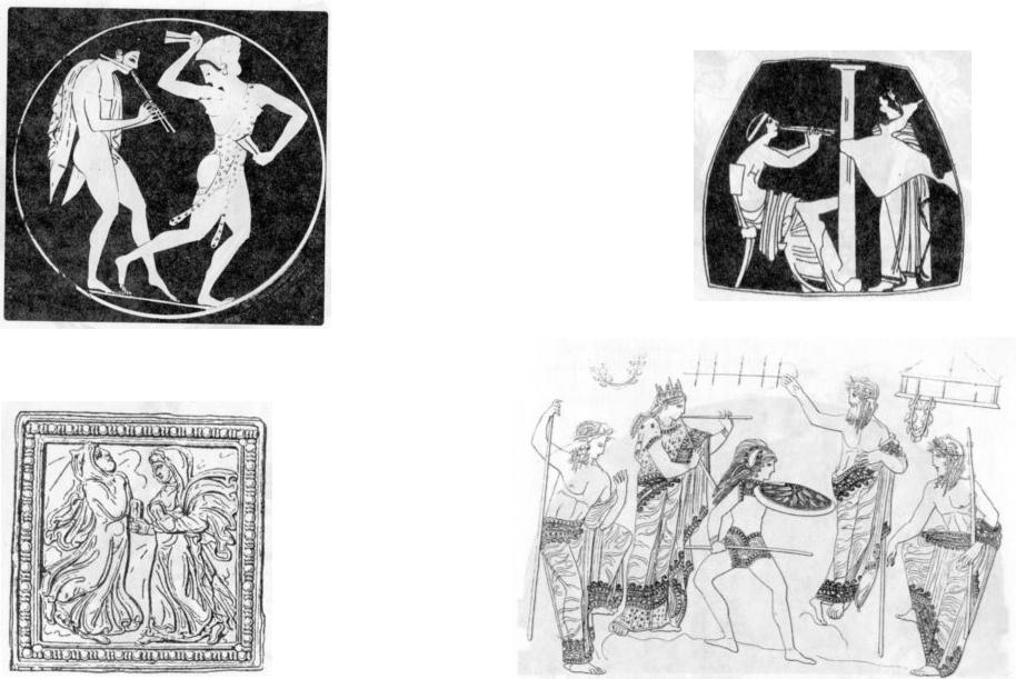 1 0 2 . А в л е т , и г р а ю щ и й н а о д н о й т р у б к е а у л о с а . Ф р а г м е н т м е д а л ь о н а к р а с н о ф и г у р н о г о к и л и к а и з О л ь в и и . С е р е д и н а V в . д о н . э .