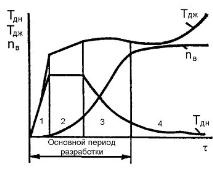 1 - освоение эксплуатационного объекта; 2 - поддержание высокого уровня добычи нефти; 3 - значительное снижение добычи нефти; 4 - завершающая