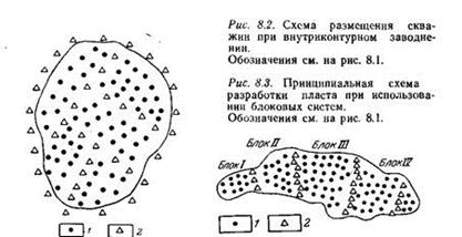 Внутриконтурное заводнение применяют в основном при разработке нефтяных залежей с очень большими площадными размерами.