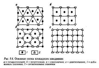 Так, в четырехточечной системе (см. рис. 2.4) соотношение между нефтедобывающими и нагнетательными скважинами 2:1, при пятиточечной системе - 1:1, при семиточечной системе - 1:2, при девятиточечной системе - 1:3. Таким образом, наиболее интенсивным среди рассмотренных являются семи- и девятиточечные системы.