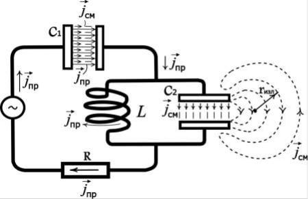 Однако на одних участках (в проводниках, в , в ) ток представлен только током проводимости, в объеме конденсатора 2, заполненном идеальным диэлектриком, – только током смещения, в конденсаторе с неидеальным диэлектриком 1 – тем и другим током. Максвелл приписал диэлектрикам свойство пропускать переменный ток – ток смещения. Это имеет исключительно важное как теоретическое, так и практическое значение. Например, пусть в конденсаторе 2 в качестве диэлектрика используется воздух. Тогда ток смещения протекает не только внутри, но и вне объема 2.
