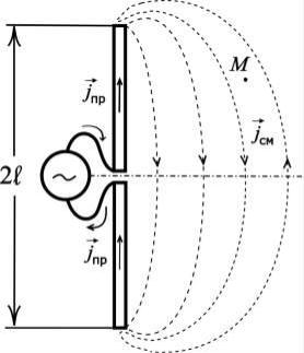 Рассмотрим точку , где появляются оторвавшиеся от антенны (или от конденсатора, или, вообще, от любой цепи переменного тока) линии тока смещения. Если окружающая антенну среда – идеальный