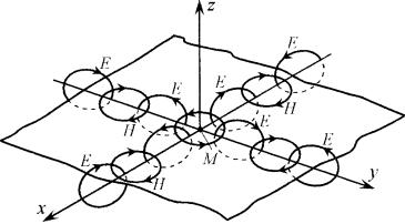 В точке протекает «цепная электромагнитная реакция»: вихрь порождает вихрь , а тот – вновь вихрь и т. д. Процесс этот, развиваясь во времени и в пространстве, формирует электромагнитную волну, разбегающуюся от точки во всех направлениях. Очень важно понять, что описанные взаимопревращения вихрей и появившись в некоторый момент времени в произвольной точке , в дальнейшем не нуждаются в действии источника переменного тока и антенны. Они существуют самостоятельно, и, если в среде нет потерь, замкнутый фронт разбегающейся (излучаемой) от точки электромагнитной волны постепенно охватит все доступное пространство.