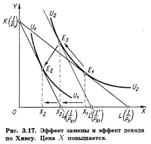 эффект дохода и эффект замены по Хиксу показано на рис.3.16. Бюджетная линия KL